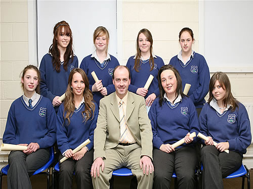 Kaylee Norris, Frances Whelan, Niamh Wade, Siobhán Nugent, Tabitha Alexander, Naoimi Lyons, Grace O’Sullivan and Hannah O’Connell who had full attendance at school for two consecutive school years. The students are photographed with Michael Drummey of David Walsh Office and School Supplies.