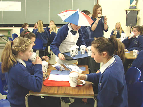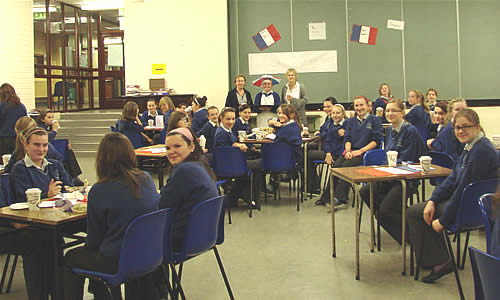 On Friday, the first year French students organised a very colourful “French Breakfast” to which they invited their classmates from the German class. The red, white and blue of the French flag coloured the senior hall with flags, posters, table settings and wonderful bilingual menus on display. With café au lait, chocolat chaud, croissants and other delights served by the extremely efficient “serveuses”, it was a very enjoyable event where the students realised there’s more to studying French than learning the verbs!!!