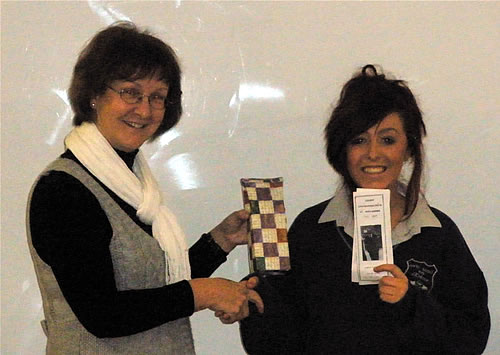 Teacher Evelyn Simons congratulates Shauna Hallahan on her presentation.