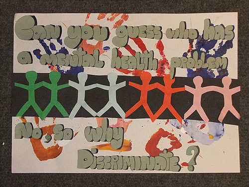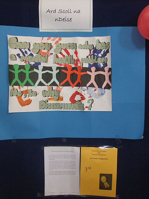 3.3 C.S.P.E. Class won third prize in a competition run by the Law Society and Amnesty International. The task was to design and create a poster about discrimination of people with mental health problems. We also had to write a piece about our idea, the design and the making of the poster.